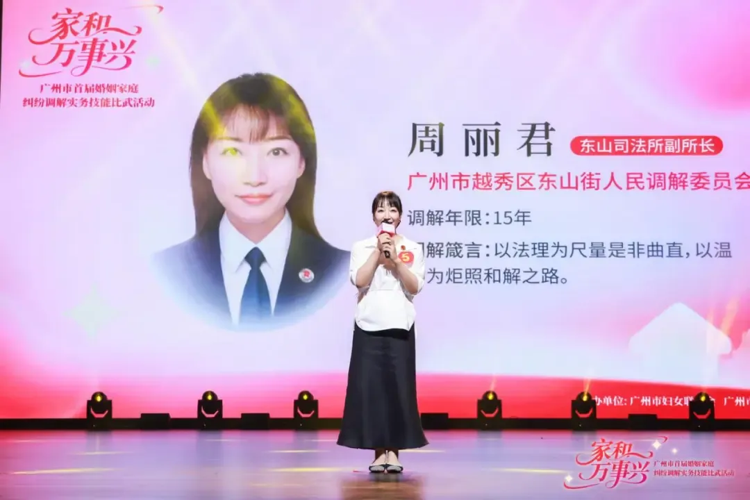周丽君是越秀区东山街人民调解委员会调解员,拥有15年调解工作经验,擅长耐心倾听、依法调解、灵活应变,以同理心引导当事人理性协商,用法理情相结合、温情疏导的方式化解矛盾纠纷。